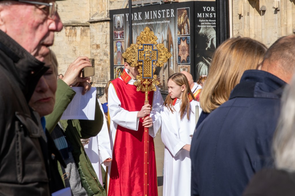 Outside York Minster on Palm Sunday 2022, the Processional Cross is ready to be lifted high