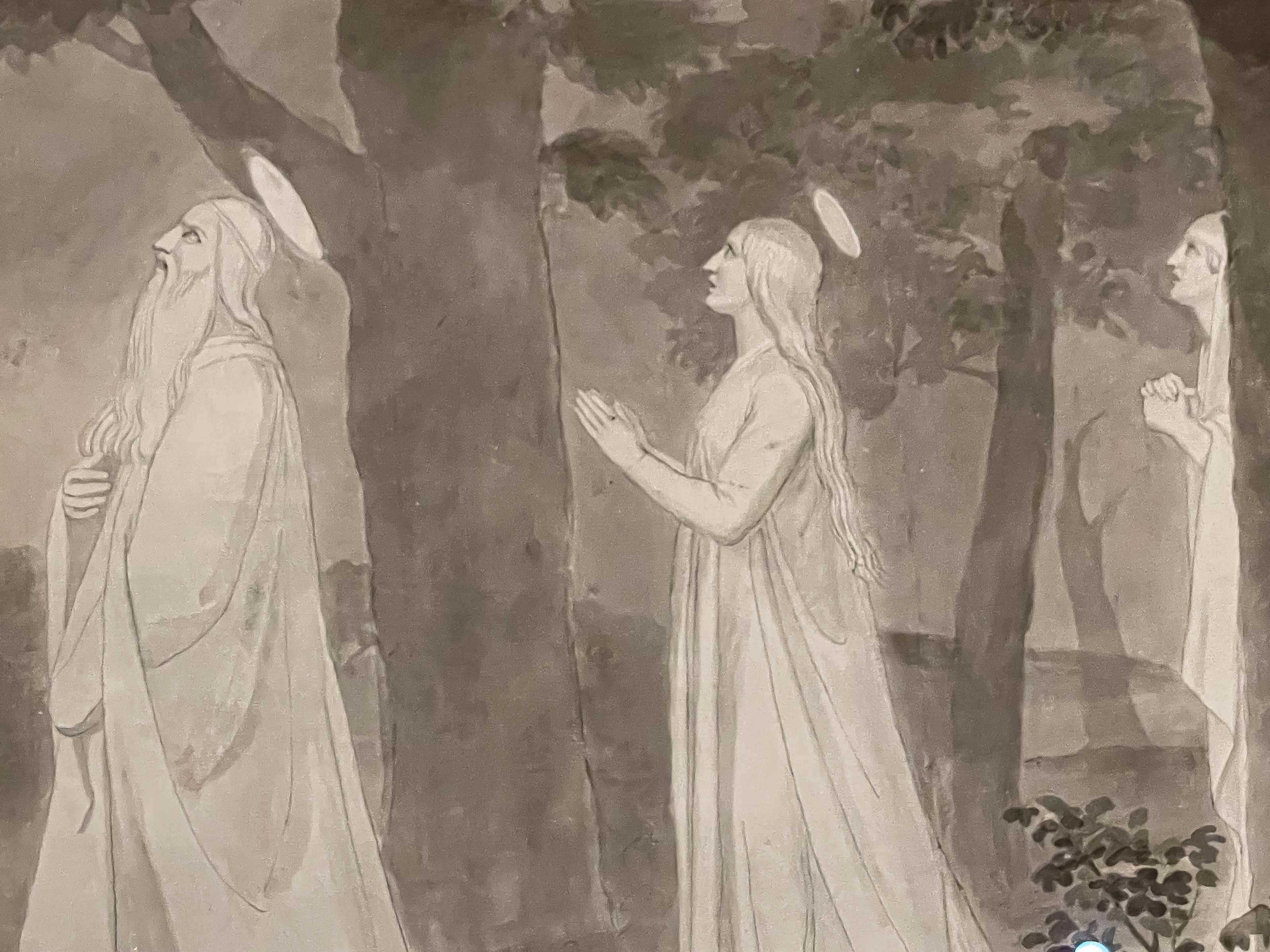 Perhaps it was due to the nature of the medium, but at the William Blake exhibition I was stopped in my tracks by a rather different impression of a halo. A key supporter of Blake during his life, the sculptor and artist John Flaxman created many mythical and Neoclassical figures. In his illustration to accompany Chatterton’s poem the Battle of Hastyngs, Flaxman depicts “Queen Kenewalcha”.