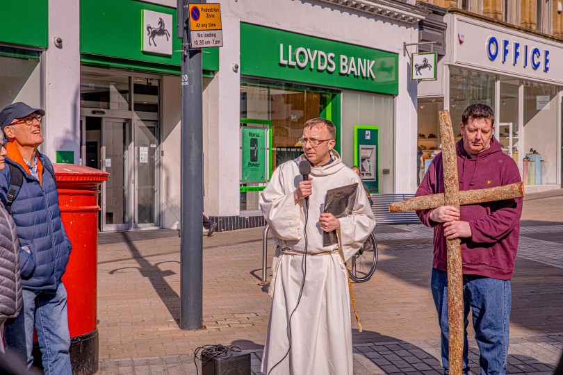 Hence, it was with some trepidation that I went along with the Gospel Streets Urban Pilgrimage in Leeds last week. Led by the admirable Lighthouse community, based in St George’s Crypt under the pastoral care of Jon Swales, the pilgrimage snaked though the streets of Leeds on a sunlit Thursday morning. Jon had a monk-ish aura wearing a cassock alb, and speaking passionately about the City while reading the Gospel of Mark. People stared at us. One passing youth shouted: “You’re all evil; you lot”.